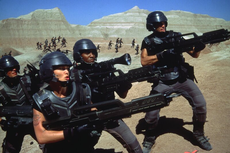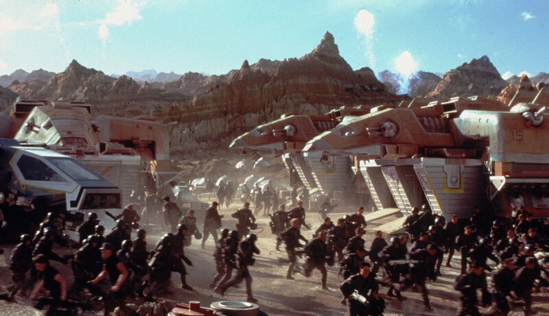 Die Erde wird von martialischen Insekten vom Planeten Klendathu bedroht. Noch ist nur wenig über die Alien-Käfer, die 'Bugs', bekannt, doch ihr Ziel ist eindeutig: Sie wollen alles Leben auf der Erde auslöschen. Unterdessen steht der attraktive und privilegiert aufgewachsene Johnny Rico kurz vor dem Abschluss der High School. Als er sich beim Militär meldet, überwirft er sich mit seinen Vater, denn Johnnys Eltern sind gegen den Entschluss ihres Filius', sich freiwillig für zwei Jahre zu verpflichten. Dabei ist Johnnys Entscheidung gar nicht von Patriotismus motiviert. Vielmehr will er seiner Freundin Carmen Ibanez imponieren. Während Johnny auf Grund seiner eher bescheidenen schulischen Leistungen der mobilen Infanterie zugeteilt wird, ist Carmen als Pilotin zu Höherem berufen und gibt dem enttäuschten Johnny recht bald den Laufpass. Johnny durchläuft nun eine knallharte Militärausbildung. Schnell findet er einen Freund in dem Draufgänger Ace Levy. Unter seinen Kameraden befindet sich auch die taffe Dizzy Flores, die schon in der High School hinter Johnny her war. Doch Johnny widmet sich lieber heroischen Taten, um seine nach wie vor geliebte Carmen zu beeindrucken. Weil er sich dabei durch außergewöhnliches Geschick und Mut auszeichnet, wird er bald zum "Squad Leader" ernannt. Leider unterläuft ihm bei einer Übung mit scharfer Munition ein fataler Fehler, der einen Kameraden das Leben kostet. Der tödliche Unfall des Kameraden wirft Johnny aus der Bahn. Mit sich hadernd und von Schuldgefühlen geplagt, kehrt er dem Militär den Rücken. Mittlerweile entwickelt sich der Konflikt mit den "Bugs" zu einem großen Krieg. Die Käfer aus dem All bombardieren die Erde mit Meteoriten: Auch Buenos Aires, Johnnys Heimatstadt, wird dem Erdboden gleich gemacht. Dabei kommen auch seine Eltern ums Leben. Voller Hass und Tatendrang - den Tod seiner Eltern und Freunde zu rächen - kehrt Johnny zurück zum Militär. Nun gilt es zu beweisen, was er in der harten Ausbildung gelernt hat. Johnny wird mit seinen Kameraden zu einem nächtlichen Einsatz auf den Planeten P kommandiert. Dort werden sie dem Feind erstmals gegenüberstehen. Kurz nach der Landung auf P beginnt die erste Attacke der 'Bugs'. Siegessicher stellen sich die Erd-Truppen den "Alien-Käfern" entgegen. Doch sie müssen recht schnell einsehen, dass der Feind sträflich unterschätzt worden ist. Die "Bugs" sind wahre, ultramörderische 'Killermaschinen', die über eine formidable Kriegsstrategie verfügen. Sie können nicht nur die Erde - per rektalem Ausstoß - mit Meteoriden beschießen, sondern auch die riesigen Weltraumschiffe mit Plasmasalven außer Gefecht setzen. Zum Schrecken des menschlichen Militärs weisen die "Bugs" eine große Artenvielfalt auf: Von tödlich effizienten Arbeiterkäfern und fliegenden Feuerinsekten über gigantische Bombeneier-Leger bis hin zu einer 'Gehirnwanze', die menschliche Gehirne aussaugt. Die Kampfkäfer erweisen sich als nahezu unbesiegbar, und die einzige Chance der Erd-Truppen besteht darin, ein Muttertier der "Alien-Käfer" in die Hände zu bekommen - den so genannten 'Brain Bug'...