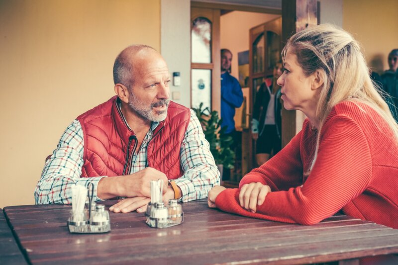 Apfelbrenner Gerhard Schütz (Simon Hatzl, li.) und die Witwe Ursula Laubner (Hilde Dalik) stehen unter Druck.