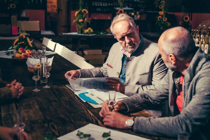 Die Apfelbrenner Reinhard Posch (Harald Krassnitzer, li.) und Gerhard Schütz (Simon Hatzl) beschuldigen sich gegenseitig.