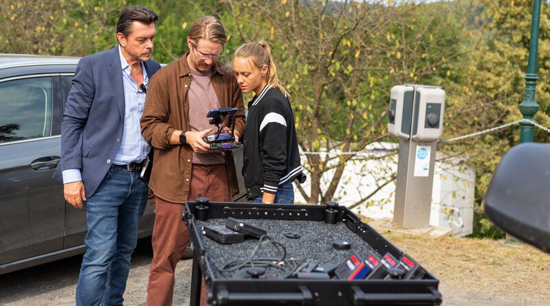 Die Grazer Ermittler Sascha Bergmann (Hary Prinz, li.), Bernd Kofler (Christoph Kohlbacher, Mitte) und Anni Sulmtaler (Anna Unterberger, re.) jagen die Feuer-Drohne.