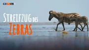 Zebraherde galoppiert über eine Sandbank am Flussufer. +++ Die Verwendung des sendungsbezogenen Materials ist nur mit dem Hinweis und Verlinkung auf RTL+ gestattet. +++