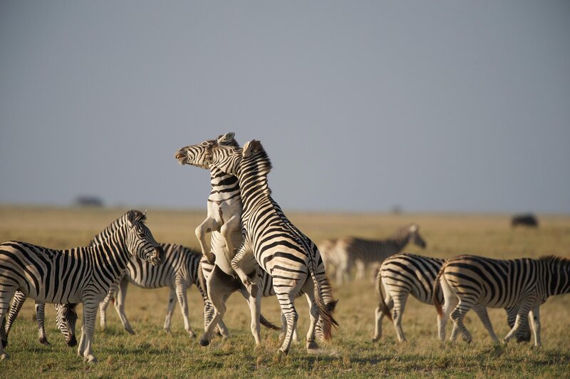 Zwei kämpfende Zebrahengste auf einer Insel inmitten der Makgadikgadi Salzpfanne. +++ Die Verwendung des sendungsbezogenen Materials ist nur mit dem Hinweis und Verlinkung auf RTL+ gestattet. +++