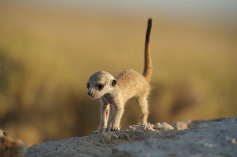 Ein Erdmännchen Junges erkundet die Umgebung seines Baues. +++ Die Verwendung des sendungsbezogenen Materials ist nur mit dem Hinweis und Verlinkung auf RTL+ gestattet. +++