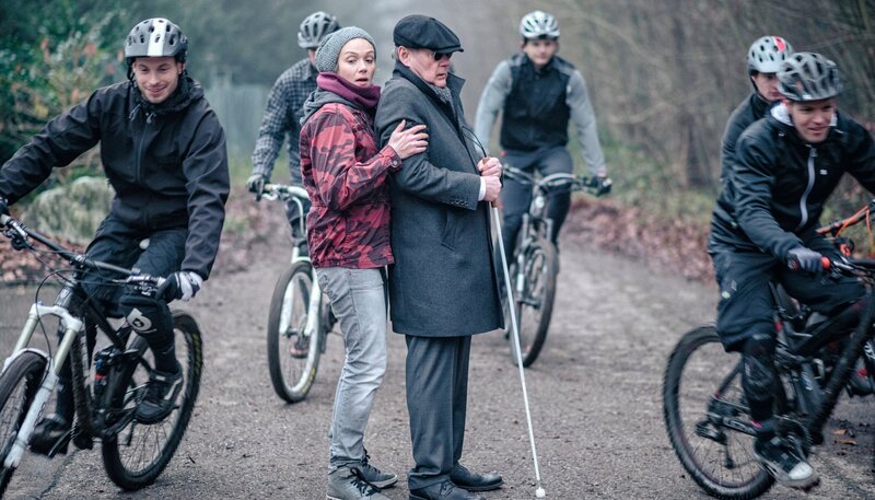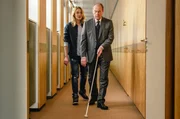 Die Blindenlehrerin Sissi (Alwara Höfels) trainiert mit dem erblindeten Stahlfabrikant Theo Olsson (Peter Haber) die Langstocktechnik.Bild: © ARD Degeto/Hendrik Heiden