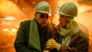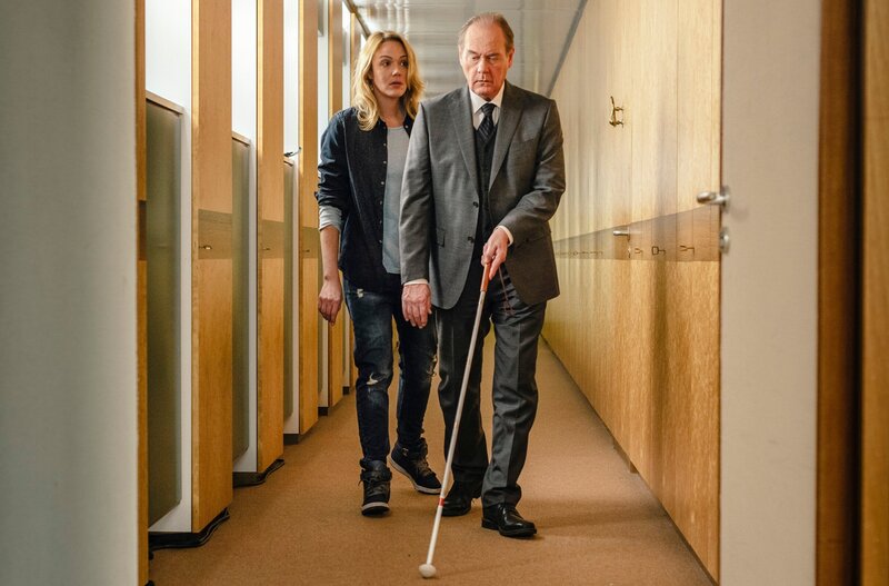 Um in sein Unternehmer zurückkehren zu können, übt der erblindete Stahlfabrikant Theo Olssen (Peter Haber) mit seiner Blindentrainerin Sissi (Alwara Höfels) den Weg durch die Fabrikhalle in sein Büro.Bild: © ARD Degeto/Hendrik Heiden