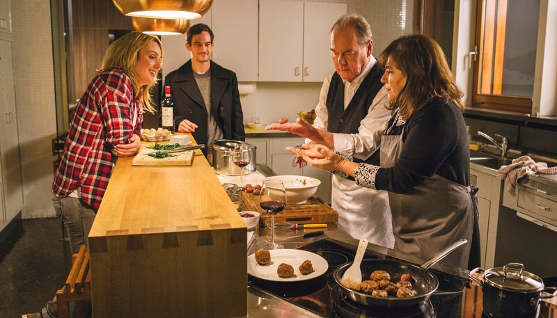Ein entspannter Abend: Mit Unterstützung seiner Haushälterin Renate Stimpfle (Gundi Ellert) entdeckt der erblindete Theo Olssen (Peter Haber) das Kochen für sich. Blindentrainerin Sissi (Alwara Höfels, li.) und sein Sohn Jens (Sönke Möhring) freuen sich über den Erfolg.Bild: © ARD Degeto/Hendrik Heiden