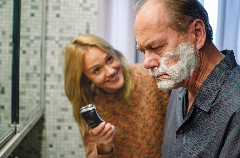 Der erblindete Stahlfabrikant Theo Olssen (Peter Haber) lässt sich von seiner Blindentrainerin Sissi (Alwara Höfels) nicht viel sagen und versucht sich, allein zu rasieren.Bild: © ARD Degeto/Hendrik Heiden