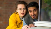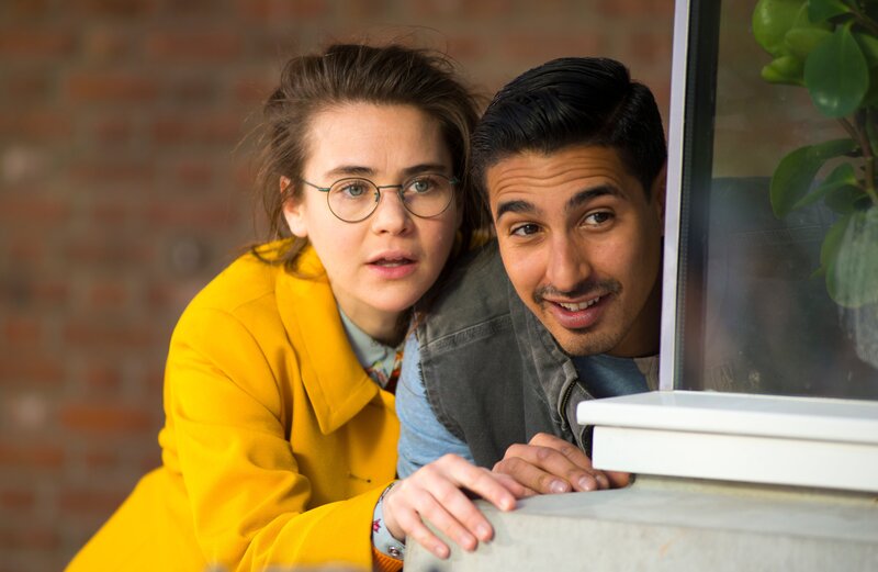 Hausmeister Hakim (Hassan Slaby) hilft Josie (Diewertje Dir), sich vor Schuldirektor Schnauzer zu verstecken.Bild: © PVPictures by Jaap Vrenegoor / ZDF und PVPictures by Jaap Vrene