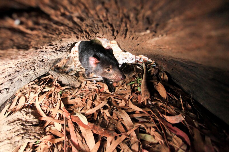 Junge Beutelteufel klettern auch auf Bäume, um dort nach kleinen Wirbeltieren, Maden oder Vogeleiern zu suchen.Bild: © Terra Mater / Matt Hamilton