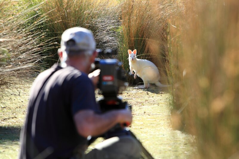 Kameramann Peter Nearhos filmt ein gar nicht scheues weißes Wallaby auf Bruny Island.Bild: © Terra Mater / Matt Hamilton