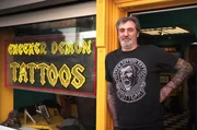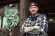 Der Besitzer Luke Atkinson vor seinem Laden "Checker Demon Tattoos" in Stuttgart.Bild: © SWR