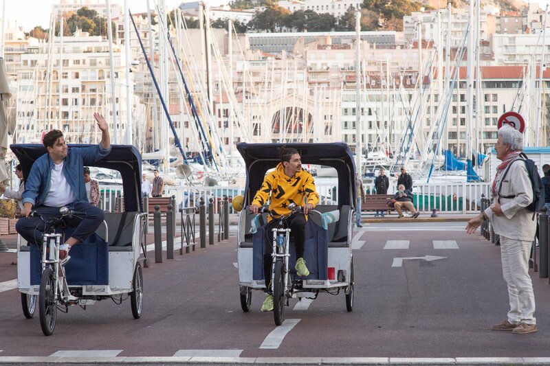 Philippe (Artus, l.) wird mangels Arbeitserfahrung zum Fahrradtaxifahrer, doch das Geschäft ist hart umkämpft.Bild: © Apollo Films