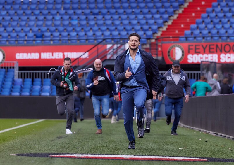 Bei einem Auftrag, der aus dem Ruder läuft, wird Dylan (Juvat Westendorp) von wütenden Fußballfans (Komparsen) gejagt, die sich für eine durch Dylan abgesagte Hochzeit versammelt hatten.Bild: © ZDF und Martijn van Gelder