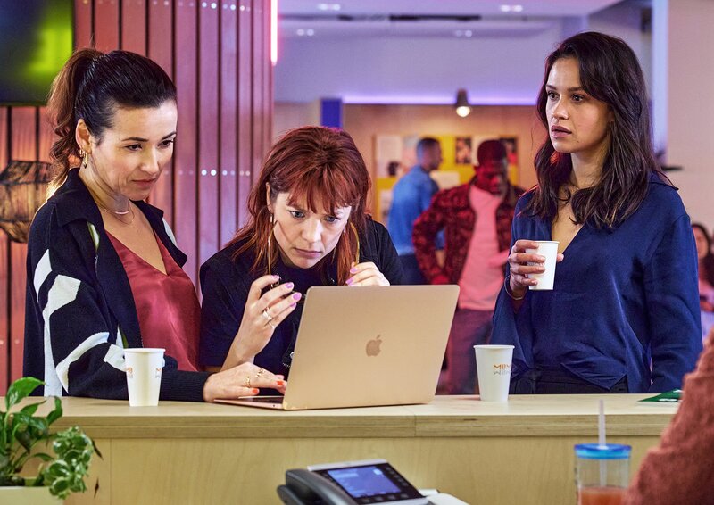 Die Verlagschefin Trix (Birgit Schuurman, l.) und die Fotografin Lana (Sarah Bannier, M.) sind wenig begeistert von der reißerischen Erstfassung von Zoës (Holly Mae Brood, r.) Artikel über den "Break-Up Club".Bild: © ZDF und Martijn van Gelder