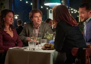 Bei einem von Mick und Lana organisierten Abendessen machen die anfänglichen Streithähne Zoë und Dylan gute Miene zum bösen Spiel. Von links: Zoë (Holly Mae Brood), Mick (Oscar Aerts), Lana (Sarah Bannier) und Dylan (Juvat Westendorp)Bild: © ZDF und Martijn van Gelder