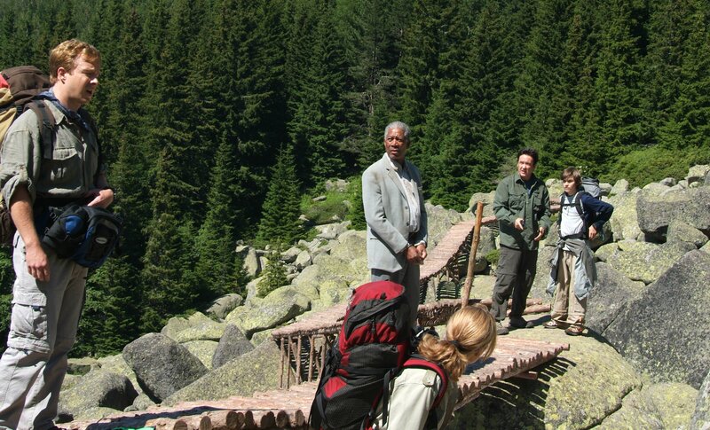 Mark (Own Taylor, l.) und Sandra (Megan Dodds) sind zufällig auf Frank Carden (Morgan Freeman, M.), Ray Keene (John Cusack, 2.v.r.) und Chris (Jamie Anderson, r.) gestossen.Bild: © Tele 5