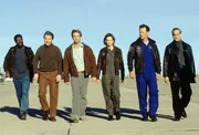 Um die Welt vor dem Untergang zu bewahren, will ein Team erfahrener Wissenschaftler und Astronauten (v.l.n.r.: Delroy Lindo, Tchéky Karyo, Aaron Eckhart, Hilary Swank, Bruce Greenwood, Stanley Tucci) in der Nähe des Erdmittelpunktes eine Atombombe zünden ...Bild: © Paramount Pictures