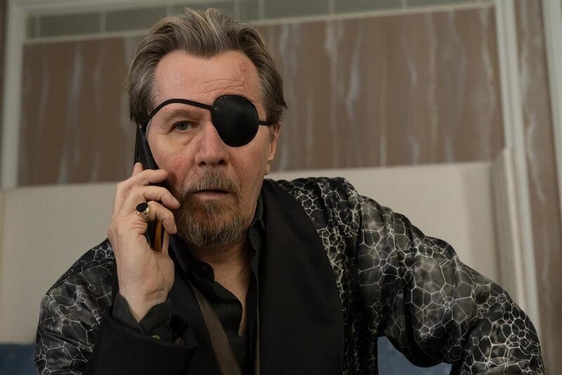 Der Kurier (Olga Kurylenko, M.) legt sich mit dem mächtigen New Yorker Paten Ezekiel Mannings (Gary Oldman, r.) an, zu dessen bezahlten Handlangern auch Agent Bryant (William Moseley, l.) gehört.