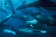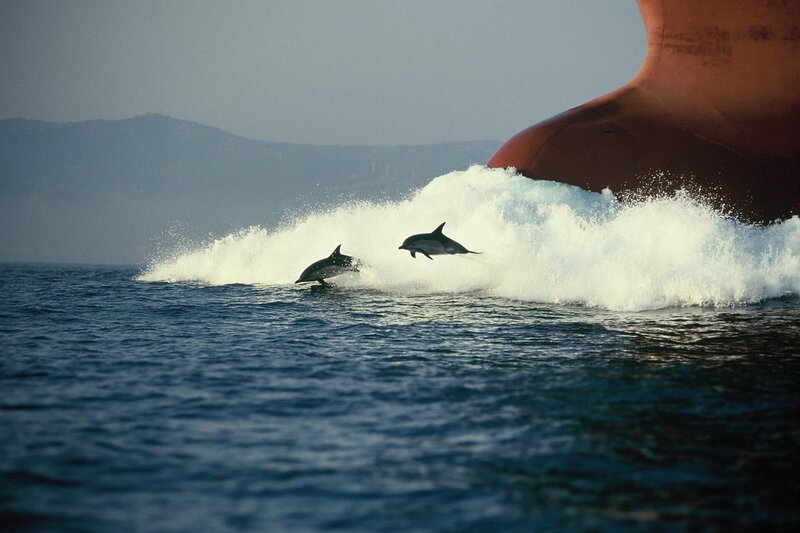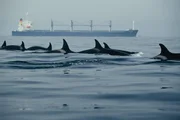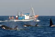 The Last Giants - Wenn das Meer stirbt... (D 2009) Regie: Daniele Grieco Schwertwale schwimmen an einem Fischerboot vorbei. Die Orcas folgen häufig den zum Thunfischfang ausfahrenden Fischern.