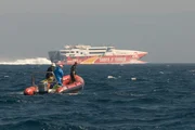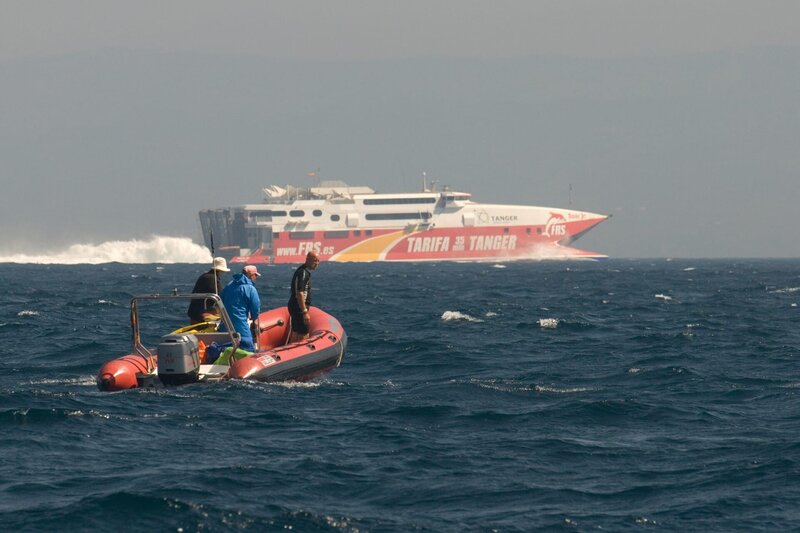 The Last Giants - Wenn das Meer stirbt... (D 2009) Regie: Daniele Grieco Das Filmteam bei den Dreharbeiten. Im Hintergrund die Schnellfähre, die Europa mit Afrika verbindet.