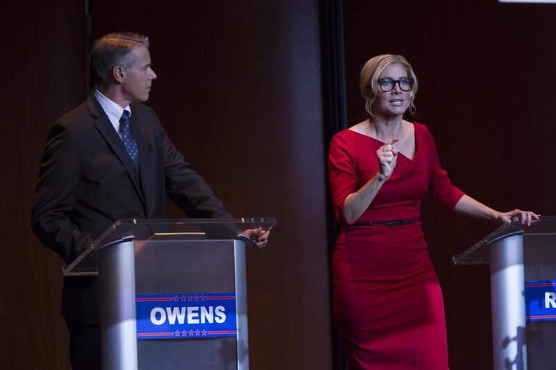 Minister Edwindge Owens (Kyle Secor, l.); Senatorin Charlie Roan (Elizabeth Mitchell, r.)Bild: © UNIVERSAL STUDIOS. ALL RIGHTS RESERVED./Michele K. Short
