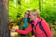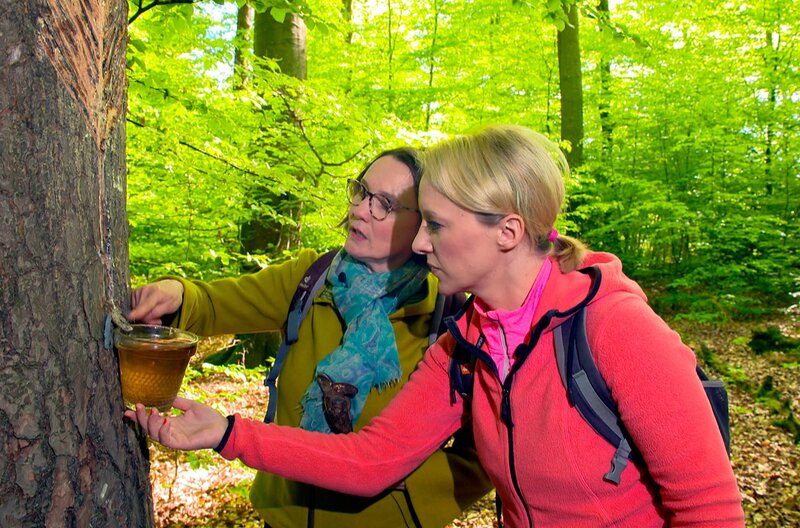 Anna Lena Dörr (re.) und Naturführerin Heidrun Johner-Allmoslöchner (li.) sammeln im Pfälzerwald Fichtenharz.Bild: © SWR