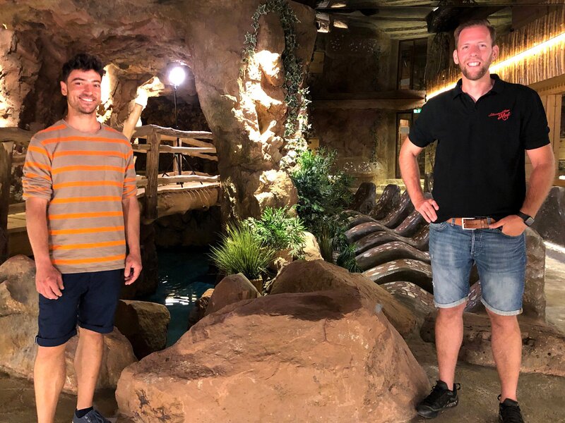 So kann Camping auch aussehen. Moderator Ramon Babazadeh (li.) mit Markus Schäfer (re.) im Wellnessbereich des Campingplatzes Schwarzwälder Hof.Bild: © SWR/Daniel Richter
