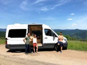 Camping mit Aussicht. Alex und Max zeigen Moderator Ramon Babazadeh (re.) ihren Campingvan.Bild: © SWR/Daniel Richter