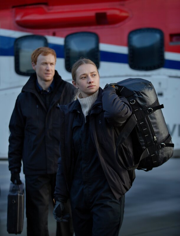 Um nach Überlebenden zu suchen, müssen Sofia (Kristine Kujath Thorp, r.) und ihr Kollege Arthur (Rolf-Kristian Larsen, l.) auf die zerstörte Bohrinsel in die Nordsee fliegen.Bild: © ServusTV