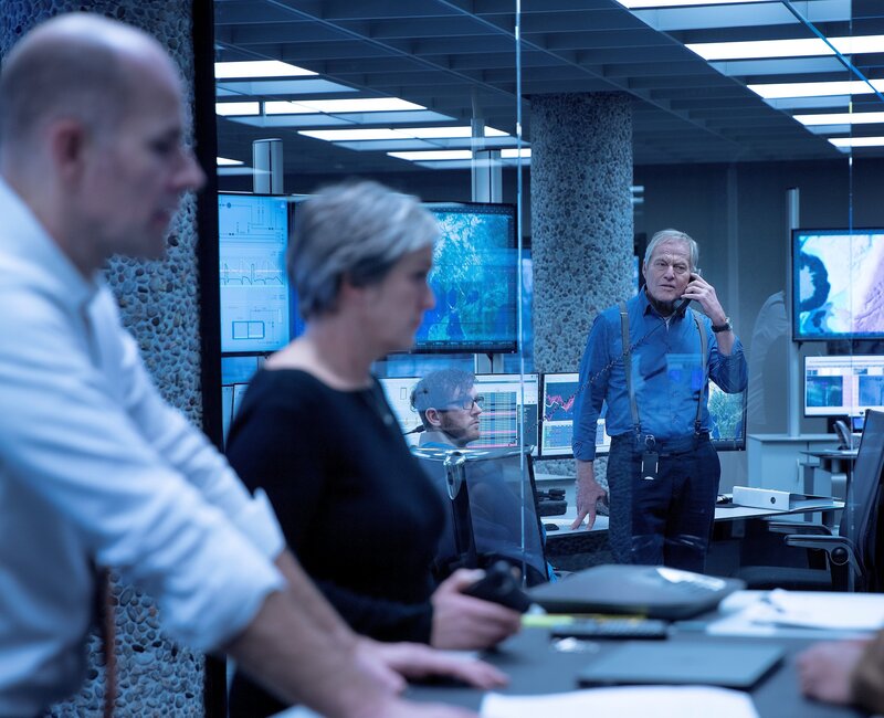In der Zentrale der Ölfirma SAGA versucht deren Chef, William Lie (Bjørn Floberg, r.) sich einen Eindruck vom Ausmaß der Katastrophe in der Nordsee zu machen.Bild: © ServusTV