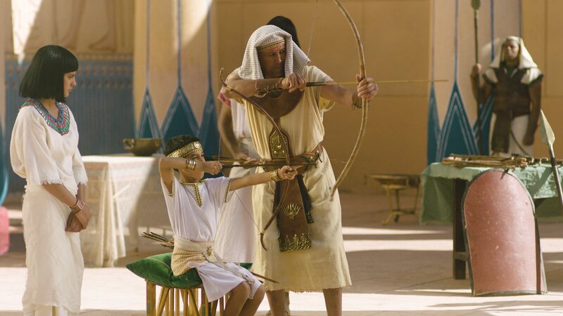 Der kleine Tutanchamun wird von seinem militärischen Berater, General Horemheb, im Bogenschießen unterrichtet.Bild: © ZDF und Adnane Korchyou