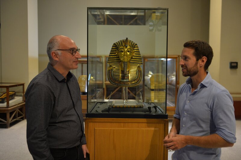 Mirko Drotschmann befragt den Ägyptologen Prof. Dr. Tarek Tawfik zur neuesten Forschung über Tutanchamun.Bild: © Christoph Mohr / ZDF