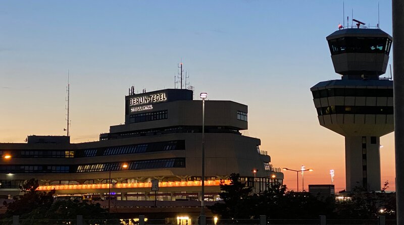 Der City-Airport TXL war ein Wunder, weil er funktionierte, obwohl er längst an seinen Grenzen gestoßen war. Hier wurden Staatsgäste, Weltmeister und Rockstars empfangen, pendelten Geschäftsleute und starteten Urlauber. Der Film zeigt die erstaunliche Geschichte des Flughafens und feiert seine Architektur. - Flughafengebäude und Tower in Tegel in der Abenddämmerung.