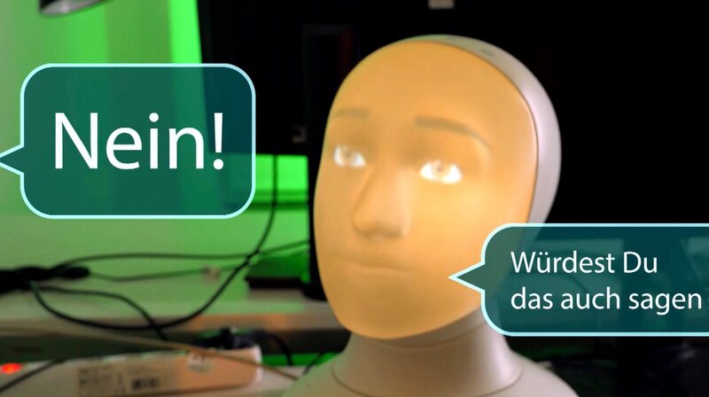 An der Uni Darmstadt beantwortet Roboter "Alfie" moralische Fragen.Bild: © HR/Sarah Plass