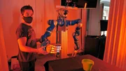 Ein Student der TU Darmstadt zeigt dem Roboter die Bewegungen, die er später ausführen soll.Bild: © HR/Sarah Plass