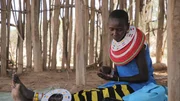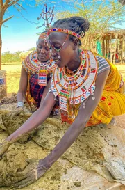 In Umoja gibt es keine Arbeit, die die Frauen nicht selber machen. Christine Sitiyan (re.) mischt Kuhdung, Asche und Wasser zu einer Art Mörtel an, um eine der traditionellen Hütten zu reparieren.Bild: © SWR/Sina Hutt