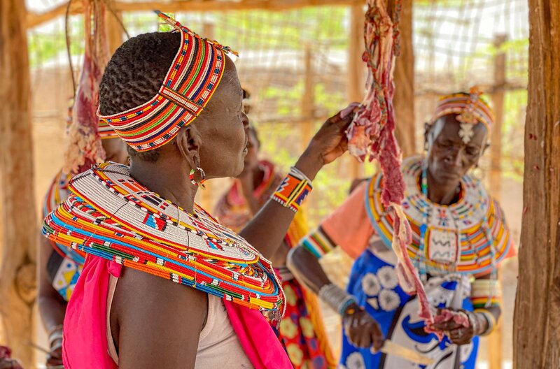 Jane Leng’ope (li.) prüft das Ziegenfleisch. Anlässlich des Schulbeginns haben die Frauen von Umoja einen Ziegenbock geschlachtet, der das ganze Dorf satt machen soll.Bild: © SWR/Sina Hutt