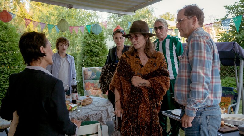 Schlechte Idee: Fred (Godehard Giese, re.) hat für Karla (Iris Berben, 3. v. re.) Gudrun (Daphna Rosenthal, li.) zum Grillen eingeladen.Bild: © ARD Degeto/Hagen Bogdanski