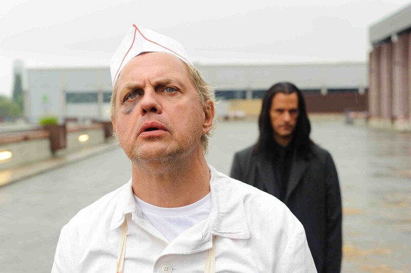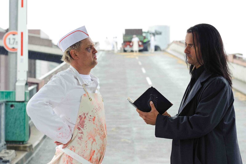 Als der Tod (Christoph Maria Herbst, r.) Lars Müller (Uwe Ochsenknecht, l.) mit den Worten: "Wir arbeiten im gleichen Geschäft" die Botschaft seines baldigen Ablebens präsentiert, will der Metzger dies nicht wahrhaben und schickt ihn wieder fort. Jedoch vergebens ...Bild: © SAT.1 / Willi Weber