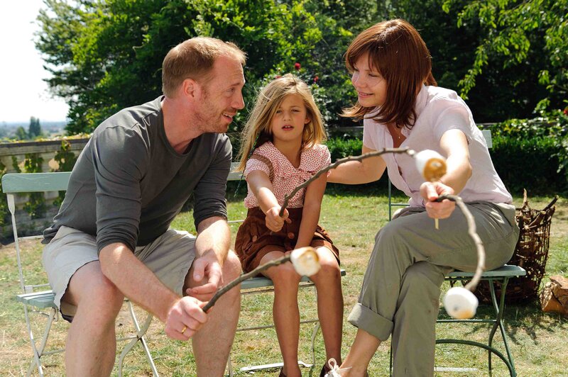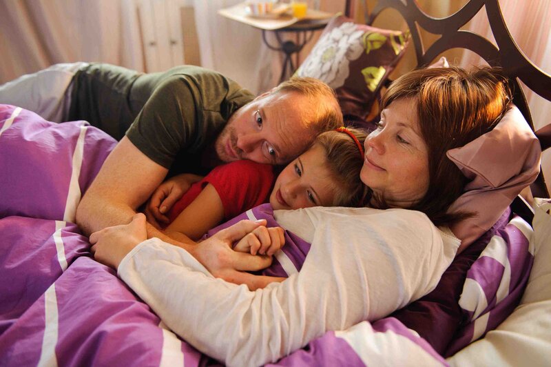 Weder ihr Mann (Johann von Bülow, l.) noch ihr kleine Tochter Lucy (Emma Schweiger, M.) ahnen, dass der Tod Jela (Annette Frier, r.) nicht mehr von der Seite weicht ...Bild: © SAT.1 / Willi Weber