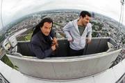 Nur einen einzigen Freund hat der Tod (Christoph Maria Herbst, l.): Fensterputzer Rudi (Fahri Yardim, r.), der täglich mit seinem Leben spielt, weil er dem Leben nichts mehr abgewinnen kann ...Bild: © SAT.1 / Willi Weber