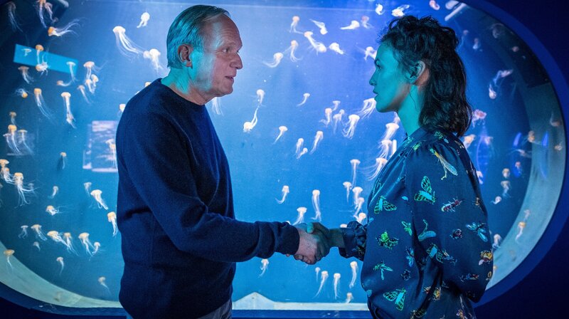 Der Aquariumsdirektor Georg (Ulrich Tukur) hat sich in die jüngeren Zoologie-Doktorandin Laura (Lucie Heinze) verliebt.Bild: © ARD Degeto/Boris Laewen