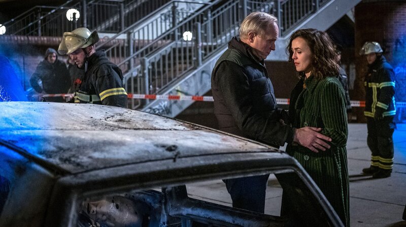 ARD Degeto UND WER NIMMT DEN HUND?, am Montag (29.06.20) um 20:15 Uhr und um 02:10 Uhr im ERSTEN. Georg (Ulrich Tukur) versucht seine neue Freundin Laura zu beruhigen, deren Auto (Lucie Heinze) durch ein Feuer zerstört ist. © ARD Degeto/Boris Laewen, honorarfrei - Verwendung gemäß der AGB im engen inhaltlichen, redaktionellen Zusammenhang mit genannter Degeto-Sendung und bei Nennung "Bild: ARD Degeto/Boris Laewen" (S2+). ARD Degeto/Programmplanung und Presse, Tel: 069/1509-335, degeto-presse@degeto.deBild: © ARD Degeto/Boris Laewen / ARD Degeto/Programmplanung und P