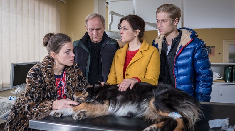 ARD Degeto UND WER NIMMT DEN HUND?, am Montag (29.06.20) um 20:15 Uhr und um 02:10 Uhr im ERSTEN. Wenn es um den Hund geht, sind die Lehnerts wieder vereint: Georg (Ulrich Tukur) und seine Frau Doris (Martina Gedeck) mit ihren Kindern Tom (Anton Rubtsov, re.) und Lisa (Giulia Goldammer, li.) beim Tierarzt © ARD Degeto/Boris Laewen, honorarfrei - Verwendung gemäß der AGB im engen inhaltlichen, redaktionellen Zusammenhang mit genannter Degeto-Sendung und bei Nennung "Bild: ARD Degeto/Boris Laewen" (S2+). ARD Degeto/Programmplanung und Presse, Tel: 069/1509-335, degeto-presse@degeto.deBild: © ARD Degeto/Boris Laewen