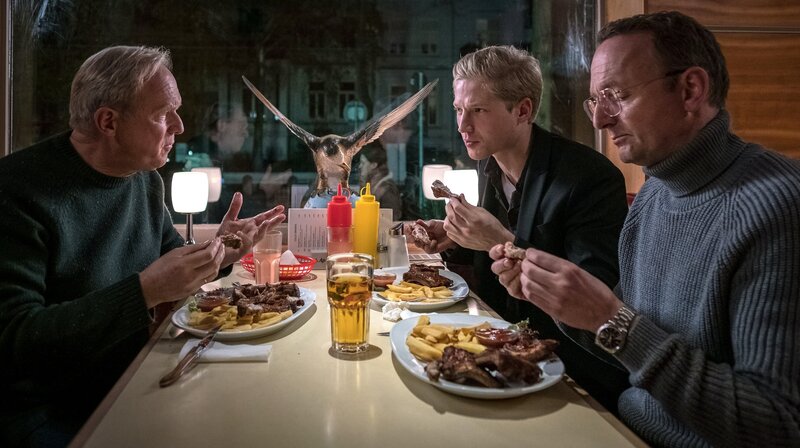 Georg Lehnert (Ulrich Tukur, li.) beim Essen mit seinem Sohn Tom (Anton Rutsov) und seinem besten Freund Peter (Peter Jordan, re.).Bild: © ARD Degeto/Boris Laewen
