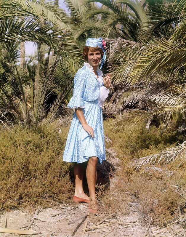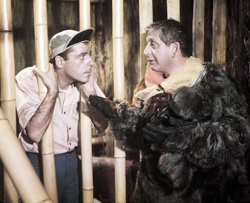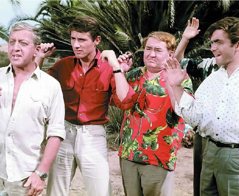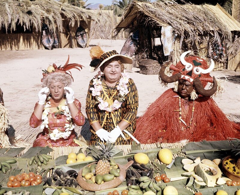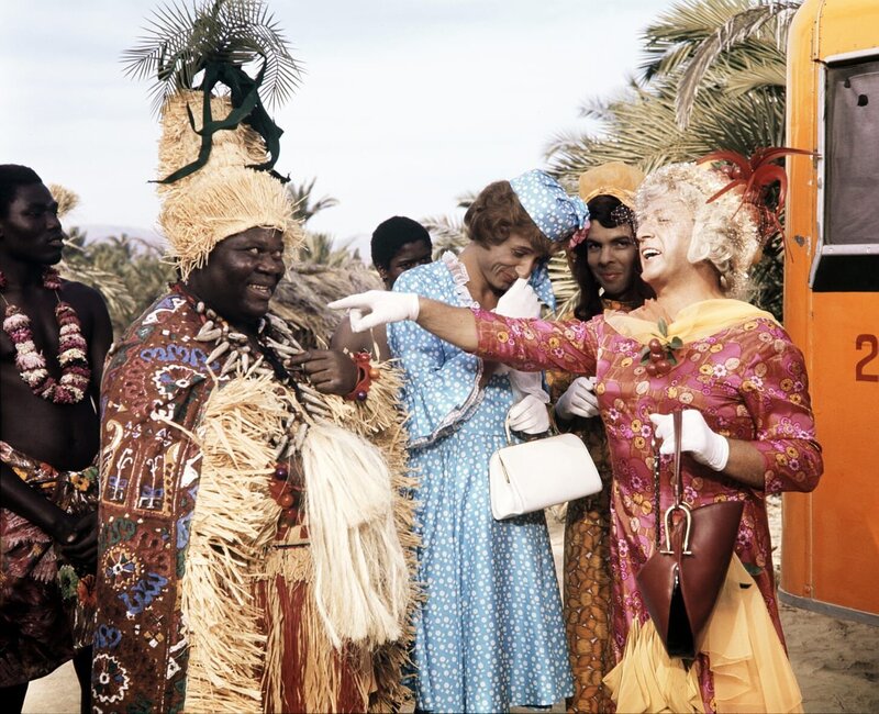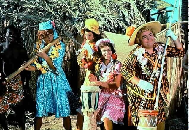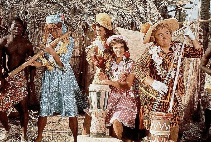 Nach einer Notlandung im Dschungel muessen die Musiker der Kapelle "Die Sonnyboys", als Frauen verkleidet, um ihr Leben musizieren. Pit (Udo Juergens, 2.v.l.), Paul (Wolfgang Jansen, 3.v.l.), Gus (Gus Backus, 2.v.r) und Hyacinth (Kurt Grosskurth, r.) sind unter Kopfjaeger geraten, die allerdings nur an maennlichen Koepfen interessiert sind.Bild: © ORF