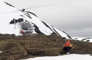Der Geologe Gregory De Pascale untersucht vor einem Helikopter das Gestein auf dem Vulkan „Mate Grande“.Bild: © Cábala