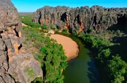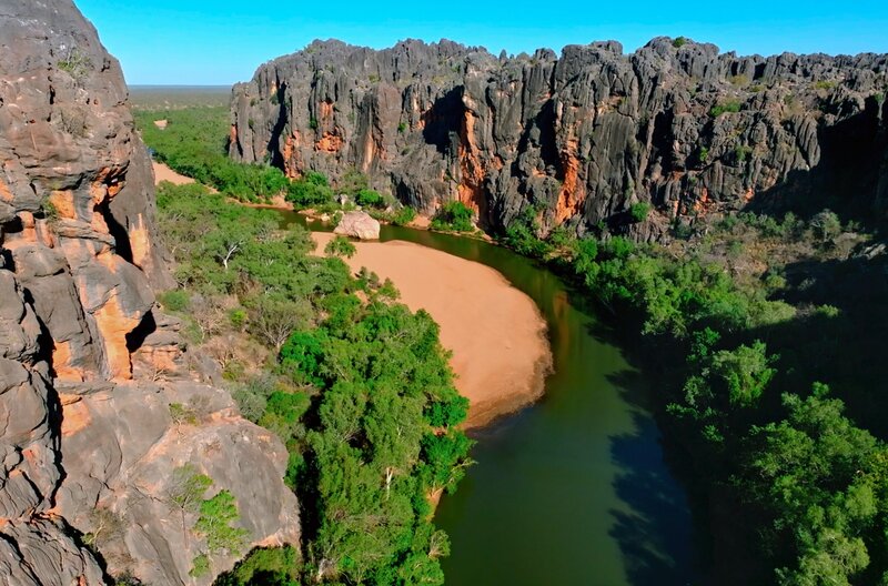 Am südlichen Rand der Kimberley-Region ragt ein Korallenriff aus dem Wüstenboden – der Lennard River teilt das kleine Gebirge.Bild: © phoenix/SWR/Peter Moers