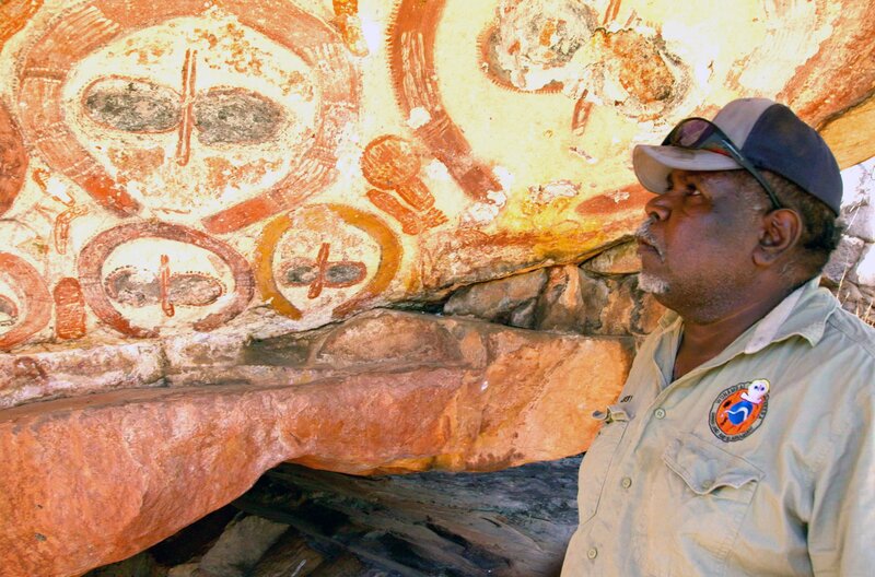 Stammesältester Jeremy vom Volk der Wunambal Gaambera vor Felsmalereien seiner VorfahrenBild: © phoenix/SWR/Peter Moers