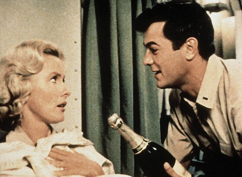 Leutnant Evans (Tony Curtis) versucht sich bei Barbara (Dina Merrill) mit erstklassigem Champagner lieb Kind zu machen.Bild: © 3sat